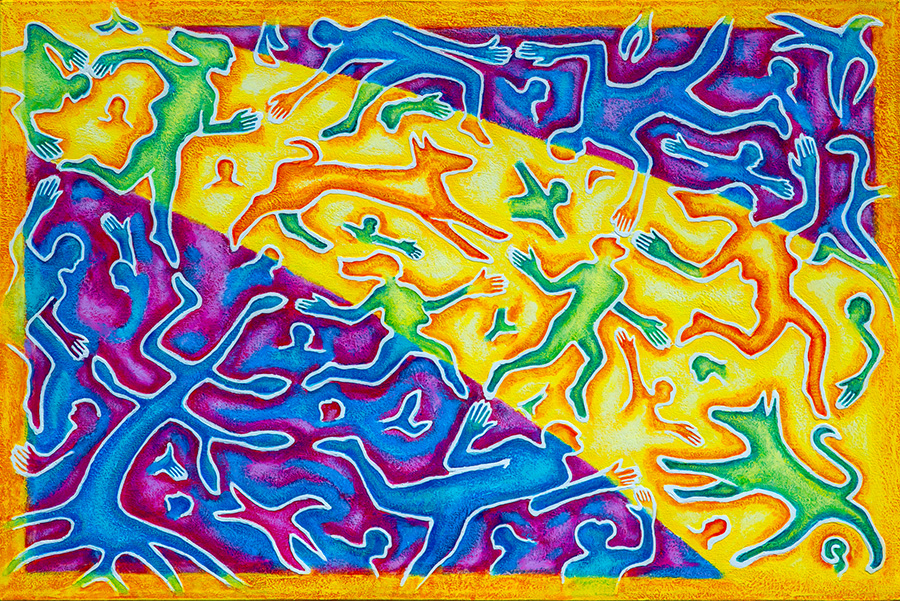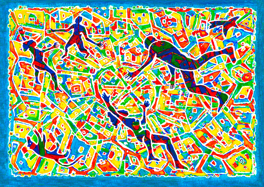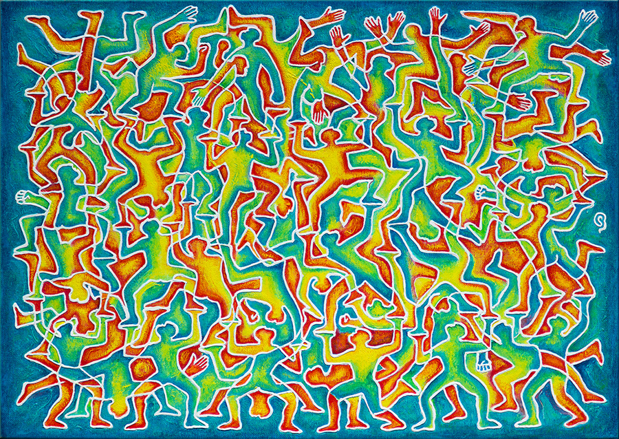 Nei tuoi quadri non c’è mai una impostazione prospettica (tranne qualche raro caso) ma più una sovrapposizione di piani bidimensionali dove figure piccole affianco a figure grandi affollano e si rincorrono in un apparente caos, che riempie tutto lo spazio della tela. Questo tuo modo di rappresentazione può essere una forma di critica alla superficialità di contenuti della società contemporanea?