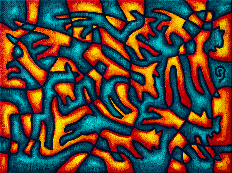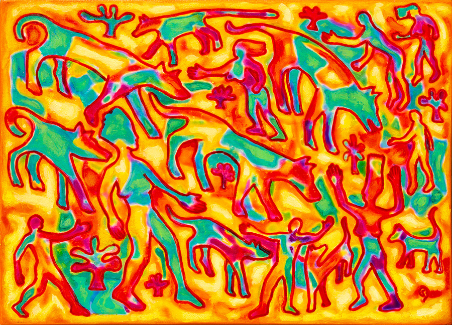 Altro esempio, “Cani che inseguono gatti di Schrodinger”; senza titolo potrebbe essere visto come un semplice gioco astratto di colori; forse neanche le sagome degli animali sarebbero state riconosciute.